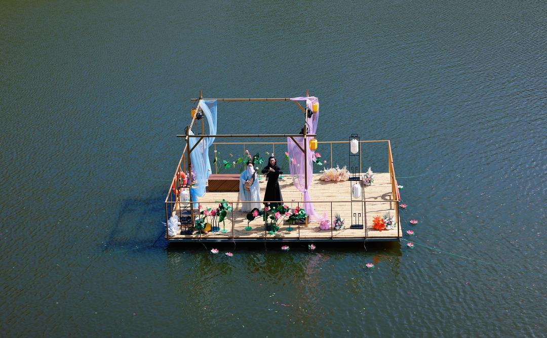 演艺总导演王岩、王猛介绍:“效果呈现上,我们在蒙山顶的演出,在保留了祈福框架的基础上,运用了多种艺术手段,增强观演效果;在九龙潭,则运用了山体环绕声场、环绕灯光、撞色技术以及空中威压技术和水上悬浮舞台等,大幅提升了演艺观赏性。此外,所有散点演艺均设置了沉浸打卡舞台,让游客在每一处演出点都能看到精致的演出。”