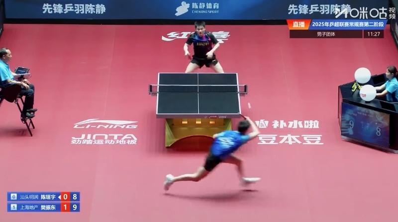 7月27日,乒超第二阶段激战正酣,上海地产集团与汕头明润的第2盘男单打响,樊振东与05后小将陈垣宇对对碰,冲击11连胜。