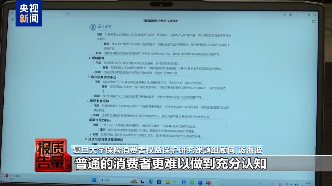 复旦大学保险消费者权益保护研究课题组顾问 汤海波:本身保险专业和以保险为核心的医药健险康养多种服务生态的专业知识框架,即使是保险的专业人士或者保险专业的营销人员,也不是都能够做到对这些知识框架,对产品和服务的体系充分了解。普通的消费者更难以做到充分认知。互联网营销很容易出现一些以偏概全,引导消费者过于关注某些部分内容,从而让他忽略了一些内容,对消费者自身权益,做出一些错误的判断。