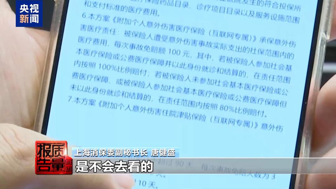 上海消保委副秘书长 唐健盛:在线上其实就变成形式上的合规。按照相关规定,所有要告诉你的,全把它放上去,但是通过一些设计,能够做到99.99%的人是不会去看的,因为我让你看的只是我想让你看的。在互联网上,其实消费者本身对于一些条款的阅读已经跟线下有完全不同的习惯,再加上做了一些希望你去做选择性忽略的设计,对消费者的知情权其实是有很大伤害的。