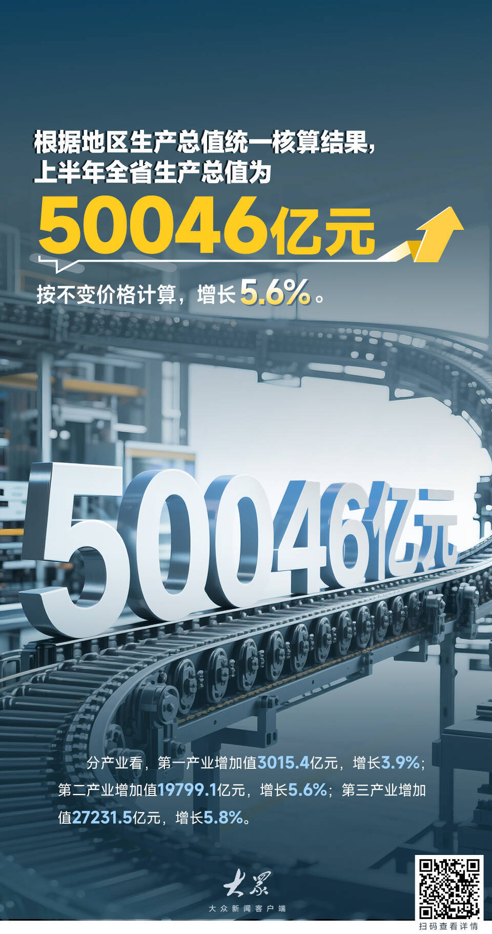 7月21日,山东省统计局公布今年上半年经济数据。根据地区生产总值统一核算结果,今年上半年全省生产总值为50046亿元,按不变价格计算,增长5.6%。