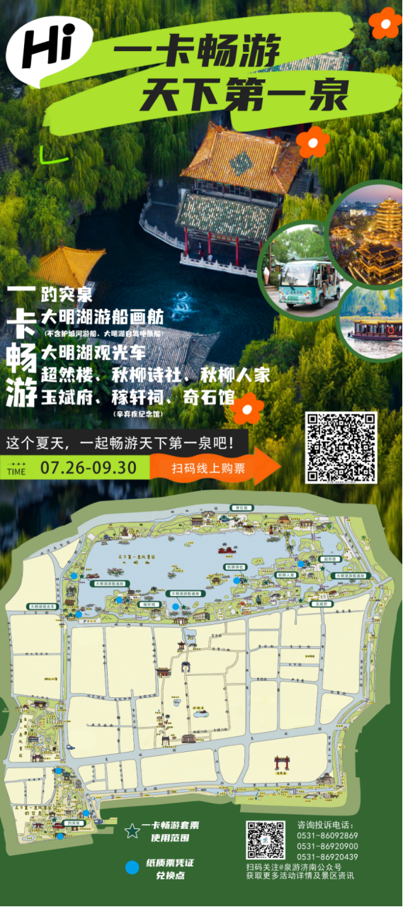 暑假期间,天下第一泉风景区推出“一卡畅游”优惠套票。九大场景,一票畅游,诚邀市民游客尽情玩转趵突胜境和明湖风光,感受泉城夏日激情。