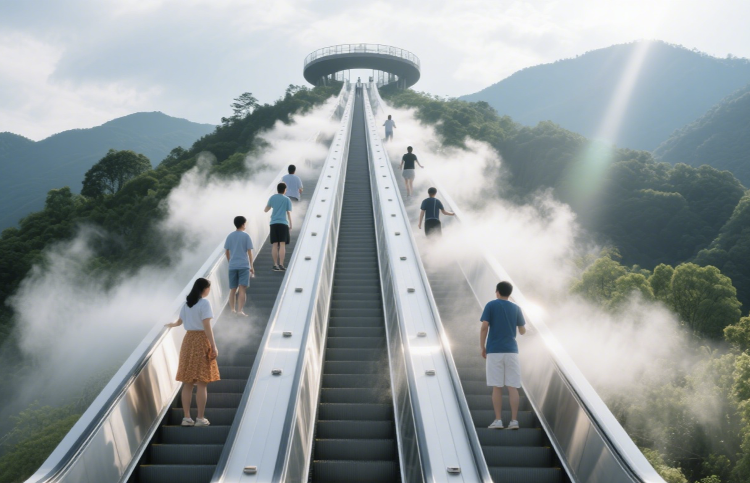 “窝囊旅游”的玩法中,最先出现的是“窝囊爬山”。如今,国内不少景区都修建了登山电扶梯,可以让游客无痛轻松登顶。在杭州淳安天屿山观景台,全长300多米的三段自动扶梯直通山顶,扶梯两侧喷洒着水雾,游客在仙气飘飘的氛围中,不知不觉就到了山顶。过去登顶要步行三千米、耗时50分钟,现在只需10分钟。看过山顶的风景后,游客还可以滑着水滑梯返回山脚,实现全程“低能耗”游玩赏景。