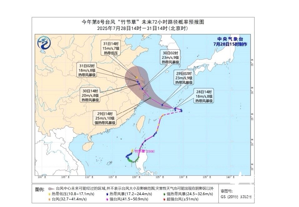 今年第8号台风“竹节草”的中心28日14时位于浙江省舟山市东偏南方向约700公里的琉球群岛以东洋面上,中心附近最大风力8级(18米/秒),中心最低气压为992百帕。预计,“竹节草”将以每小时20—25公里的速度向西偏北方向移动,强度缓慢增强,将于29日下午到夜间在浙江北部到江苏南部一带沿海登陆。