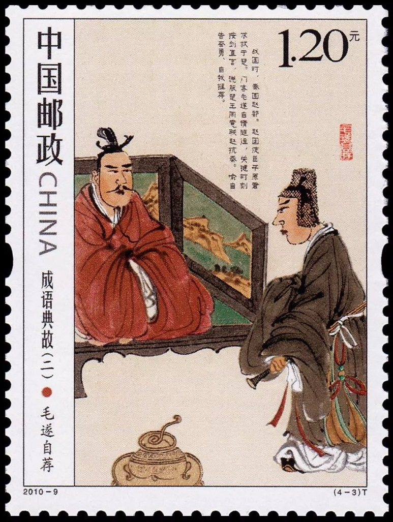 秦国在长平之战中大败赵国,坑杀赵国四十万精锐部队后,趁势围攻赵国都城邯郸,在生死存亡之际,赵国派遣平原君赵胜到楚国签订合纵盟约,请求楚国发兵攻击秦国来迫使秦国退兵。平原君准备挑选二十名门客一同前往,但挑选再三,平原君只能找到十九个能够胜任这项任务的人。这时毛遂上前向平原君自我推荐说:“我听说先生将要到楚国去签订合纵盟约,约定携门下食客二十人前往,而且不从外边寻找。现在还少一个人,希望先生能让我同你们一起出发。”这就是毛遂自荐的故事。