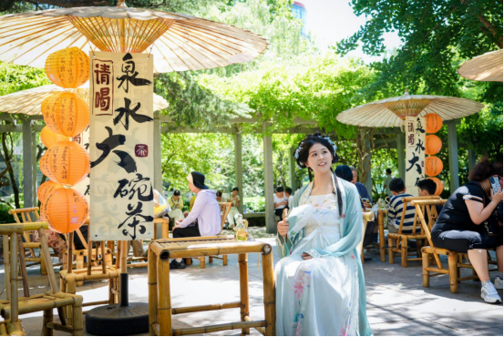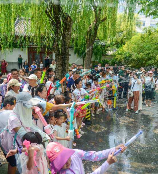 从趵突泉北门出来,马路对面便是五龙潭公园。这座闹市中的“桃花源”,一到夏天就成了遛娃胜地、戏水天堂。一年一度的五龙潭亲子泼水节正在欢乐进行,“夏日清凉市集”与“泉畔手作乐园”带来缤纷多彩的夏日饮品、创意手作和趣玩体验,一站式解锁亲子新玩法,千万不要错过。每周末下午推出“撒泼大战”“蒙眼吃瓜”等趣味游戏,还有民谣乐队演出、川剧变脸、欢乐小丑互动等精彩演艺。活动持续至8月24日。