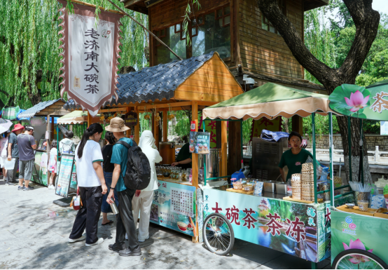 环城公园变身“流动的河畔会客厅”,除了黑虎泉打水、护城河乘船,这里又多了一项必打卡项目——“河颜悦色”仲夏市集。依托济南护城河沿线泉水文化、夜游美景和荷花元素,推出泉韵文创、非遗手作、特色饮品、泉水大碗茶、茶韵冰激凌等特色展位,营造仲夏夜浪漫氛围,丰富市民游客夏日游园体验。仲夏市集持续到8月31日(9:00至20:00),市民及游客可以来黑虎泉赏泉景、品泉茶、逛市集。