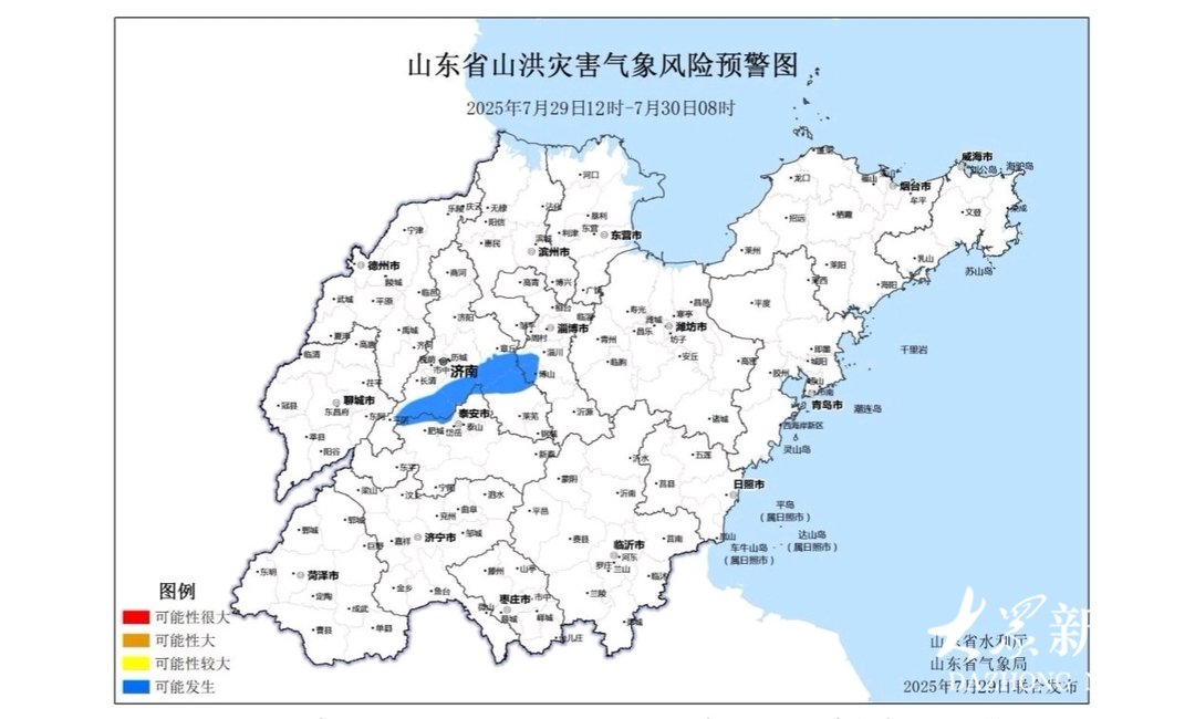 山东省水利厅和山东省气象局7月29日联合发布山东省山洪灾害气象预警:预计7月29日12时至7月30日08时,济南、淄博、泰安等市局部地区可能发生山洪灾害(蓝色预警)。