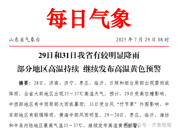 山东省气象台7月29日6时继续发布高温黄色预警: