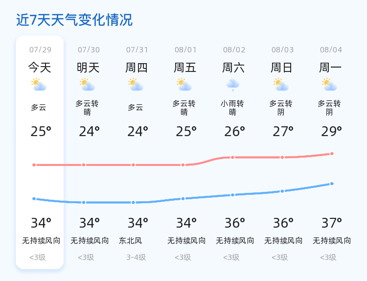 今天夜间多云,西北风2级,气温25~34℃,明天天气多云转晴,气温跟今天差不多,最高气温34℃, 最低气温24℃。