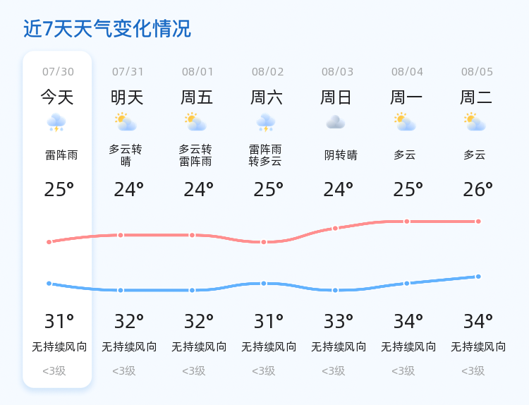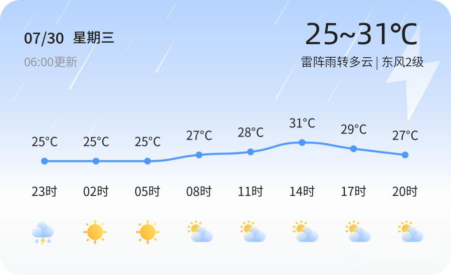 今天是7月30日,星期三,农历润六月初六。济南今日天气为雷阵雨转多云,气温在25℃至31℃之间,东风2级,湿度高达95%,空气质量良好,PM2.5指数为28。各区整体天气状况相似,市民需注意防范雷阵雨带来的短时强降雨。
