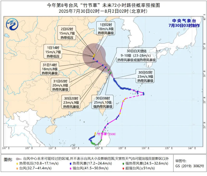 今年第8号台风“竹节草”(热带风暴级)的中心已于7月30日4时30分前后在浙江省舟山市朱家尖岛沿海登陆,登陆时中心附近最大风力有9级(23米/秒),中心最低气压为975百帕。