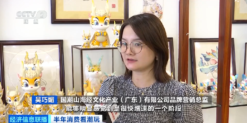 国潮山海经文化产业(广东)有限公司品牌营销总监 吴巧媚:上半年国潮玩具的业务能够明显感觉到是增速很快的一个阶段,每个月的销售额能达到一两千万元。潮玩、玩具、毛绒这些的兴起,带动了整个市场向上的景象。