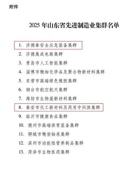 7月28日,省制造强省建设领导小组办公室印发《关于公布2025年山东省先进制造业集群名单的通知》,泰安市化工新材料及药用中间体集群和济德泰安全应急装备集群2家集群成功入选。截至目前,泰安市拥有省级先进制造业集群3家,数量居全省前列。