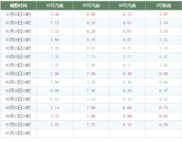 注:红色代表油价上调,绿色代表油价下调,黑色代表油价搁浅。