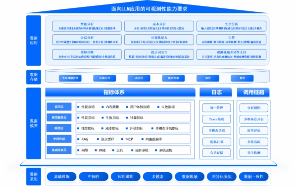 基于此,浪潮通信信息与中国信通院及各行业专家展开深入合作,经过多轮严谨讨论,共同制定出一套面向LLM 应用的可观测性能力分级要求,为行业实践提供了重要参考依据。该标准聚焦LLM应用在训练与推理过程中的可观测性建设工作,以数据的采集、建模、存储、应用为主线,对各环节所需具备的能力进行了系统性的标准化规范。