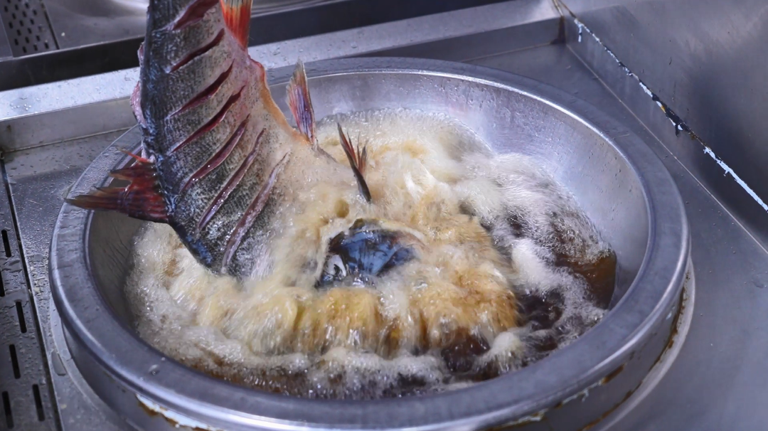 2、锅中倒入适量花生油,待油热后,把处理好的鱼放入锅中进行油炸定型,让鱼身表面形成金黄酥脆的外壳。