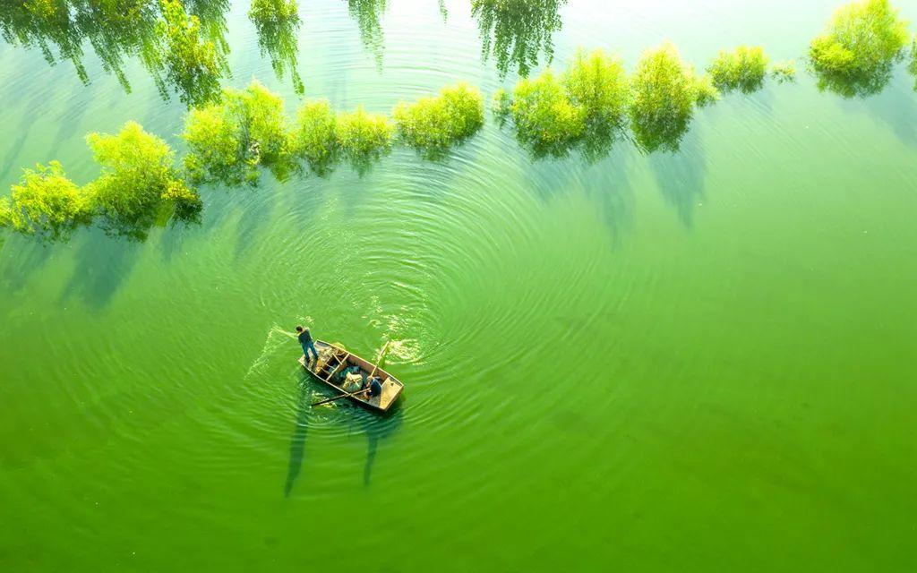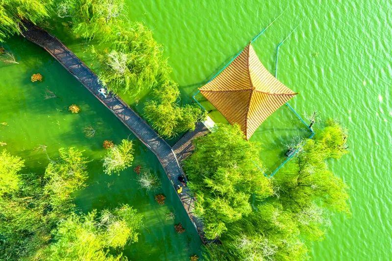 湖内烟波浩渺,水天一色,鸥鸟翔集,波光粼粼,岸边绿树掩映,唐村山、丰山、四海山、玉皇山、香山等群山环立周边,山岚耸翠,景色怡人,美丽的山水、田园风光与众多的人文史迹一起构成了一道独具特色的旅游风景线。