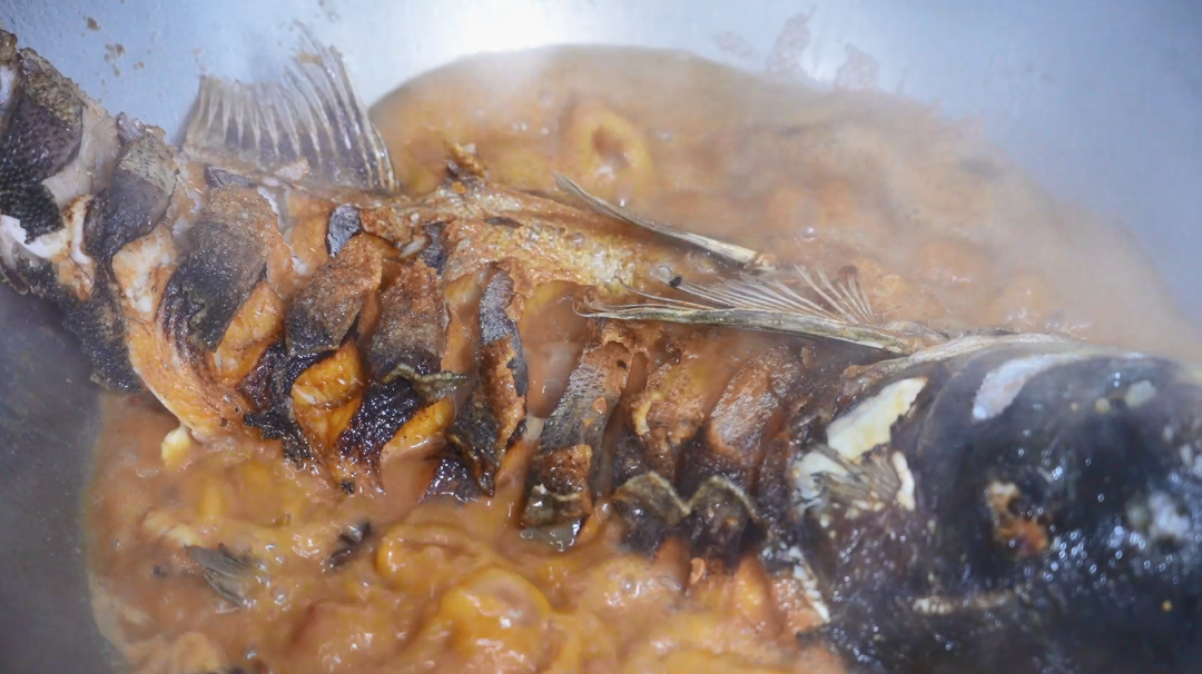 5、汤汁烧开后,放入炸好的鱼,转文火慢炖30分钟,让鱼充分吸收汤汁的精华。