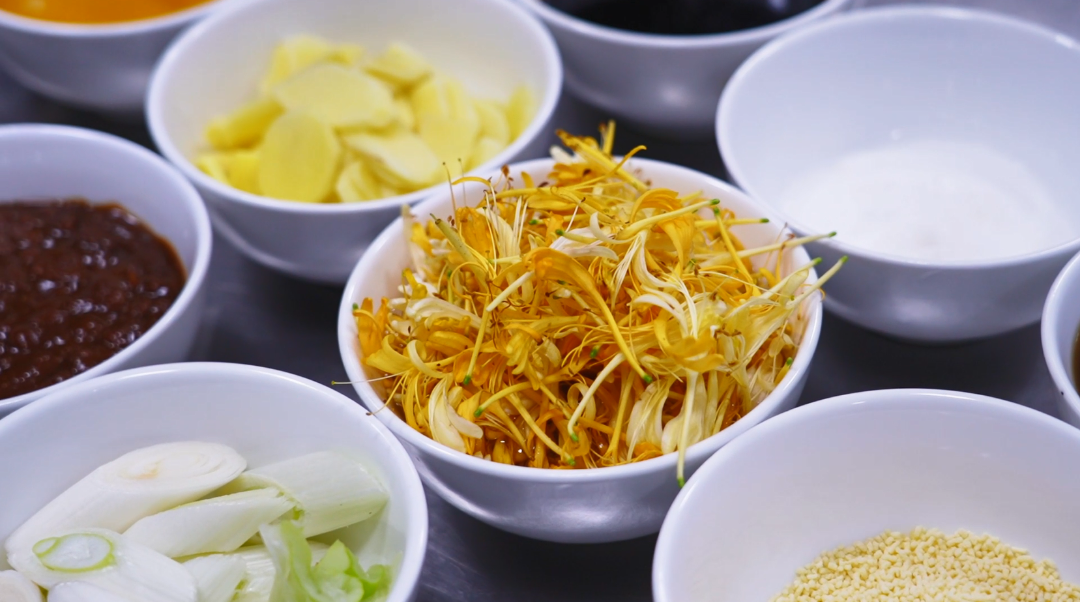 金银花开富贵鱼,寓意“金银花开,富贵有‘鱼’”,金蕊银花养生鱼头,均以本地野生花鲢鱼鱼头为主,结合平邑道地药材金银花,突出药食同源特色,既体现出鱼的鲜美,又结合金银花清热去火功效,深受广大食客喜爱和好评。