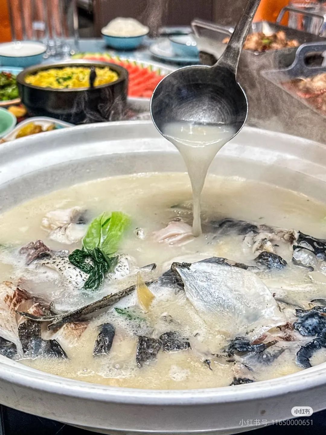 选用沂河鲤鱼头,煎至微黄,加开水煮出奶白汤汁,再放入嫩豆腐慢炖。鱼头的鲜美全融在汤里,豆腐吸足了鱼鲜,喝一口汤,吃一块鱼肉,鲜得眉毛都要掉下来。