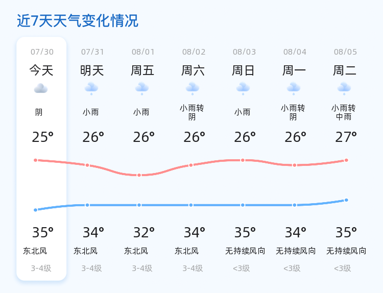 今天夜间晴转阴,东风1级,气温25~35℃,明天天气小雨,气温跟今天差不多,最高气温34℃, 最低气温26℃。