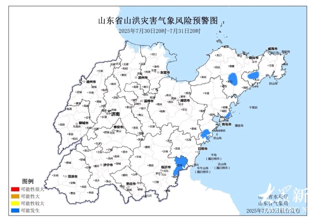 山东省水利厅和山东省气象局30日17时20分联合发布山洪灾害气象预警:预计30日20时至31日20时,青岛、烟台、威海、临沂等市局部地区可能发生山洪灾害(蓝色预警)。蓝色预警区域包括:西海岸新区中部、崂山区东部、莱阳市东北部、栖霞市南部局地、海阳市西北部、乳山市中北部、莒南县中部及东部、临沭县东北部。其他地区也可能因局地短历时强降水引发山洪灾害,各地应注意做好实时监测、防汛预警和转移避险等防范工作。