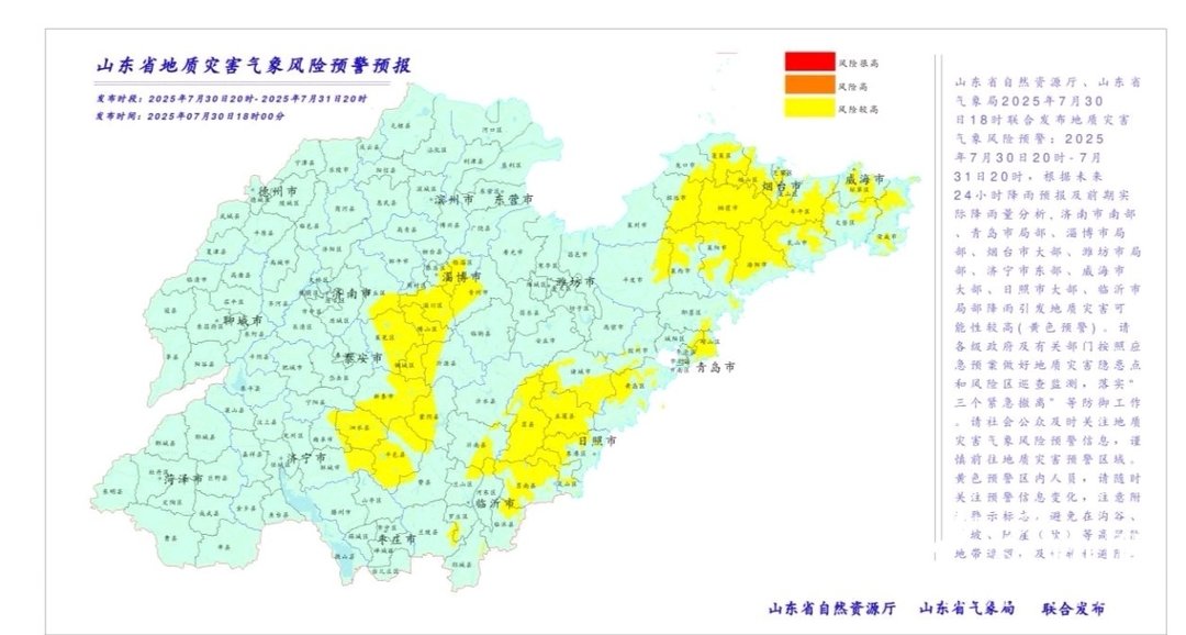 根据未来24小时降雨预报及前期实际降雨量分析,山东省自然资源厅、山东省气象局30日18时30分联合发布地质灾害气象风险预警,济南市南部、青岛市局部、淄博市局部、烟台市大部、潍坊市局部、济宁市东部、威海市大部、日照市大部、临沂市局部降雨引发地质灾害可能性较高(黄色预警)。各级政府及有关部门要按照应急预案做好地质灾害隐患点和风险区巡查监测,落实“三个紧急撤离”等防御工作。社会公众应及时关注地质灾害气象风险预警信息,谨慎前往地质灾害预警区域。黄色预警区内人员,请随时关注预警信息变化,注意附近警示标志,避免在沟谷、斜坡、陡崖(坎)等高风险地带逗留,及时转移避险。