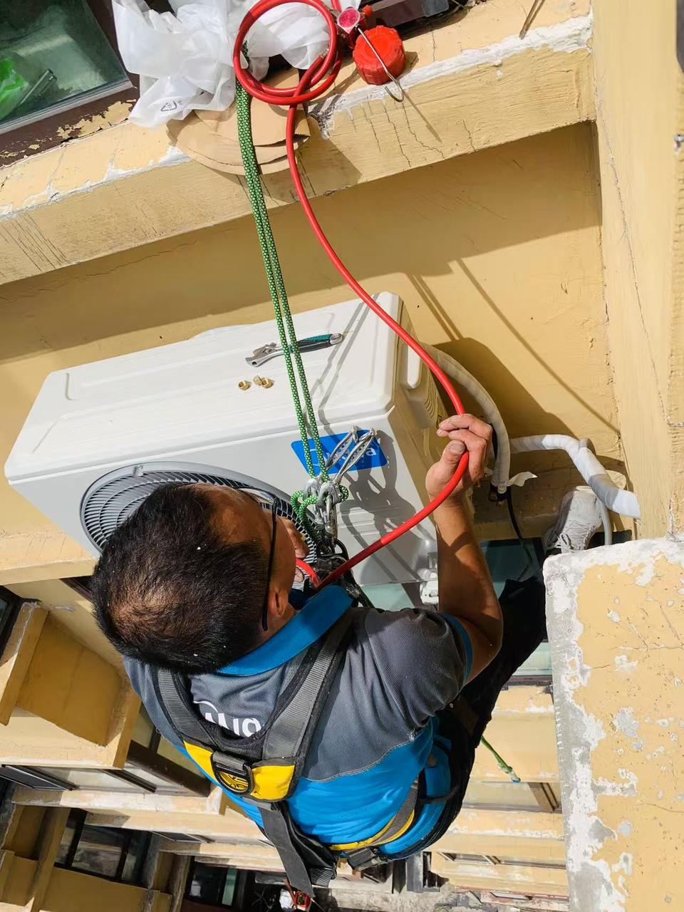 从那天起,每天清晨六七点,两人就开着车穿梭在陌生街巷。闫瑞京负责缠管子,赵景超则系着安全绳在窗外作业。长时间悬空,安全带勒得肩膀生疼,可赵景超每次都得等外机固定牢了,才敢慢慢松口气。