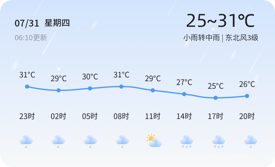 今天是7月31日,农历润六月初七,临沂市迎来持续降雨天气。根据气象部门监测,今日天气为小雨转中雨,气温介于25℃至31℃之间,东北风3级,空气湿度达91%。空气质量指数PM2.5为22,属于优级,但因降雨天气,市民出行请注意携带雨具,谨慎驾驶,确保行车安全。此外,台风'竹节草'外围云系已开始影响临沂,部分地区可能出现短时强降雨和雷雨大风,建议市民提前做好防范措施。