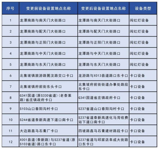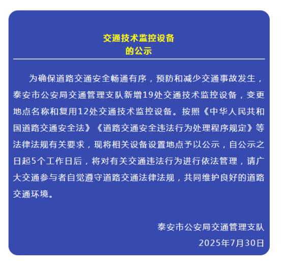 7月30日,泰安交警微信公众号发布关于新增、变更和复用交通技术监控设备的公示,具体内容如下: