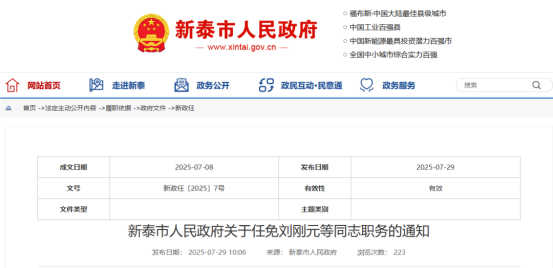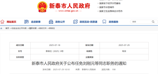 7月29日,新泰市人民政府网站发布关于任免刘刚元等同志职务的通知和关于公布任免刘刚元等同志职务的通知,具体内容如下: