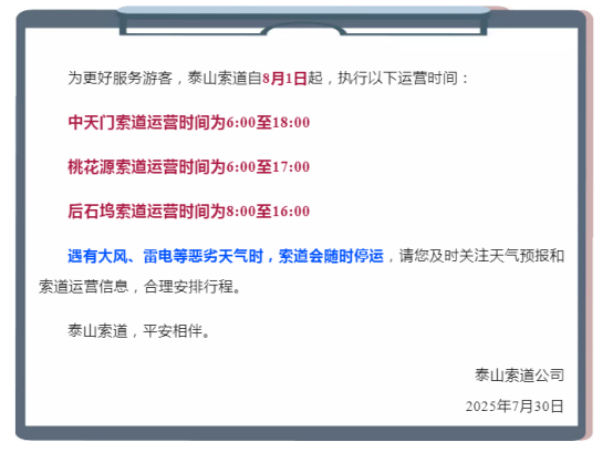 7月30号,泰山索道发布了自8月1日起调整运营时间的温馨提示,详情如下: