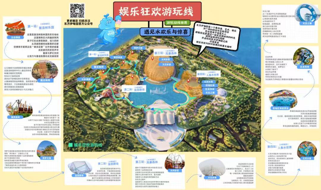 偏爱欢乐互动的游客,娱乐狂欢游玩线不容错过:在复活树森林的云朵弹跳、魔法蛛网释放活力,盐田剧场亲水看制盐舞蹈,水利妙思互动区操作水车,更有高 57.4 米的天空步道挑战刺激,人鱼水世界的天空之眼滑道、怒海狂涛造浪池等水上项目嗨翻全场。