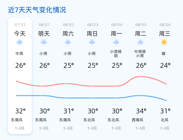 7月31日,全市天气主要以多云为主,市中、崂山等有小雨,市南、黄岛等有中雨,章丘、历下等有多云转雷阵雨,沂源、临朐等有中雨转小雨,长清、商河等有多云转阴,安丘、高密等有大雨转小雨,博兴、无棣等有阴转雷阵雨,嘉祥、梁山等有晴转多云,招远、栖霞等有小雨转中雨,东平、宁阳等有阴转多云,周村、泰山等有阴转小雨,胶州和莒南有大雨转中雨,福山有小雨转大雨,汶上有晴转小雨,新泰有雷阵雨转多云,其他地区多云转小雨,东南风3-4级。最高气温在32℃左右。
