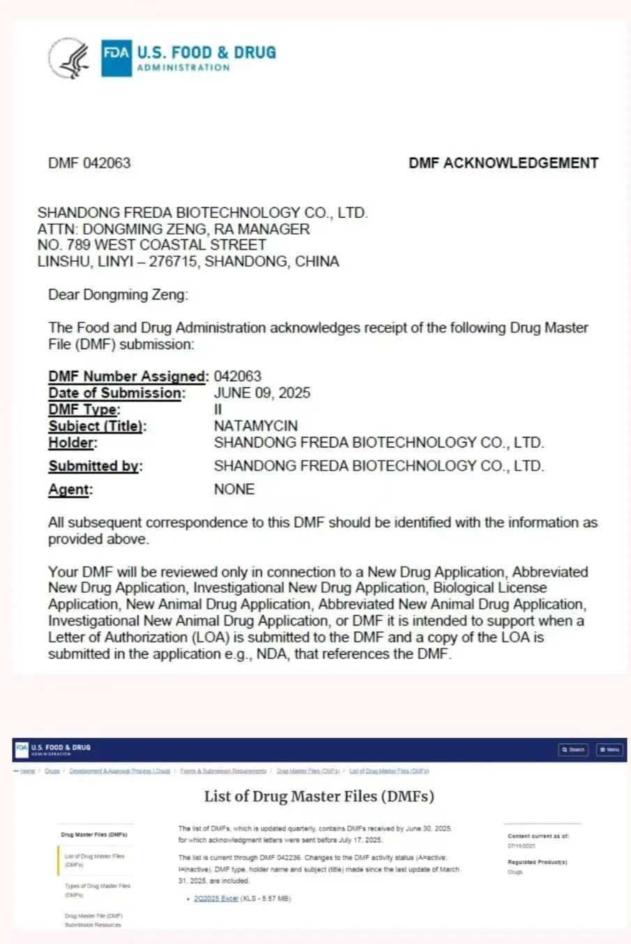 近日,鲁商集团所属福瑞达生物科技公司自主研发的纳他霉素通过美国FDA的原料药DMF备案(DMF备案号:042063),这标志着福瑞达纳他霉素在拓展海外高端市场方面获得了重要准入资质。