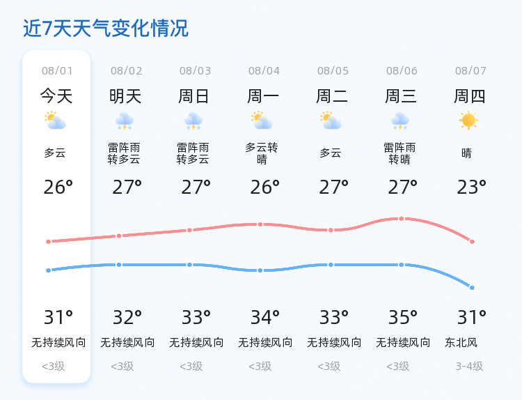 未来三天(8月3日至8月5日),东营市天气以雷阵雨转多云为主,气温在26℃至34℃之间波动。其中,8月4日和8月5日天气转晴,气温稍有回升。建议市民关注天气变化,适时增减衣物,避免因天气突变引发感冒。