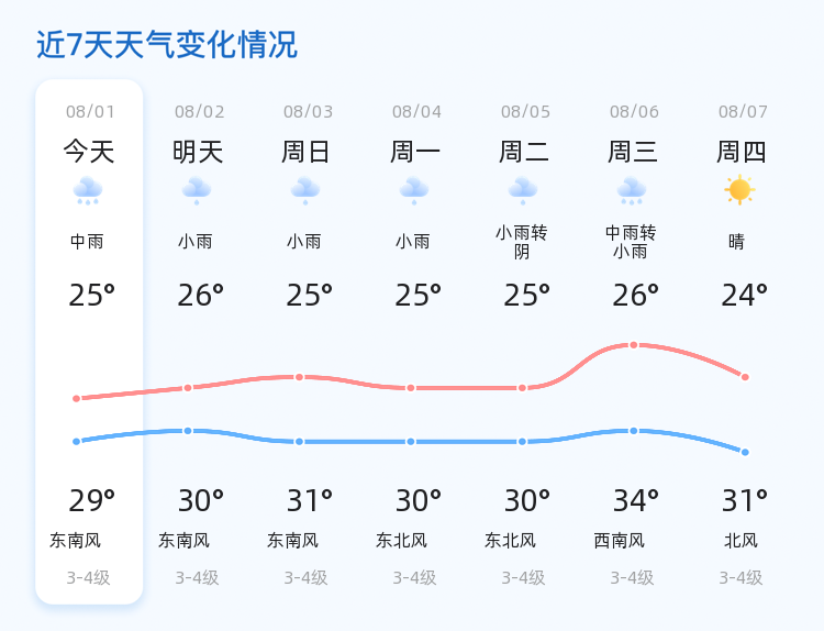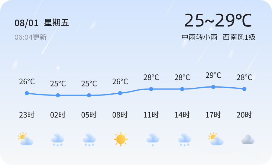 今天是8月1日,星期五,农历润六月初八。烟台市迎来中雨转小雨的天气,气温在25℃至29℃之间。整体湿度较高,西南风1级,空气质量良好。各区普遍出现降雨,市民出行需携带雨具,注意安全。