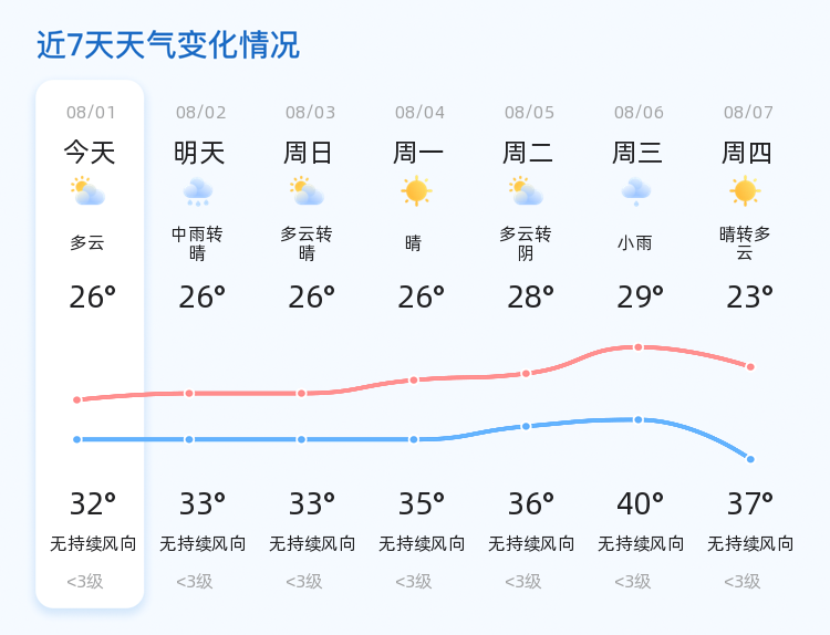 未来三天,济宁市天气以多云到晴为主,气温逐步回升,最高气温将升至35℃,最低气温维持在26℃。8月4日和5日,部分地区可能出现阴天和小雨天气,提醒市民关注天气变化,适时调整衣物,避免高温时段长时间户外活动。