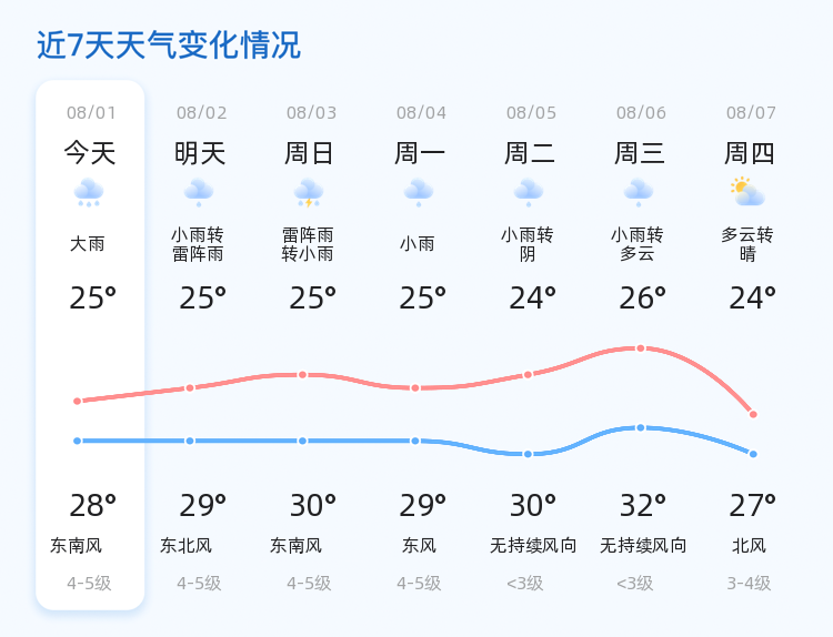 未来三天,威海市天气趋势为持续降雨,气温在25℃至30℃之间波动。8月3日为雷阵雨转小雨,8月4日为小雨,8月5日降雨逐渐减弱,转为阴天。降雨期间,风力较大,东南风或东北风4-5级,局部地区可能出现短时强降雨或雷电活动。市民应密切关注天气变化,合理安排出行计划,避免在雷雨天气进行户外活动。