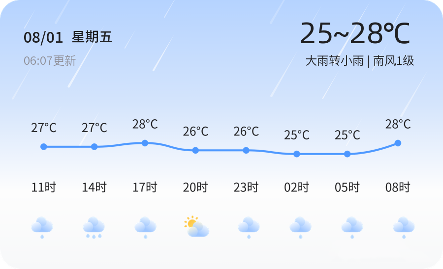 今天是8月1日,星期五,农历润六月初八。威海市迎来降雨天气,全市普遍出现大雨转小雨,气温在25℃至28℃之间,湿度较大,为84%,空气质量优良,PM2.5指数仅为6。目前实时温度为26.7℃,南风1级。各区市天气情况基本一致,均为大雨转小雨,风力适中,市民出行需携带雨具,注意交通安全。