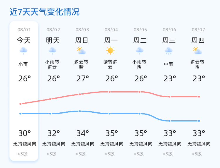 今天夜间中雨转小雨,东风3级,气温26~30℃,明天天气小雨转多云,气温跟今天差不多,最高气温32℃, 最低气温26℃。