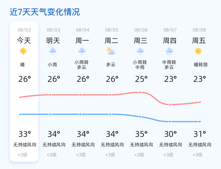 今天是8月2日,农历润六月初九,星期六。潍坊市今日天气以晴转小雨为主,气温较为适宜,最高气温33℃,最低气温26℃。目前气温为25.9℃,东南风1级,空气湿度为99%,PM2.5指数为15,空气质量良好。各区天气情况基本一致,均为晴转小雨,风力较小,体感舒适。