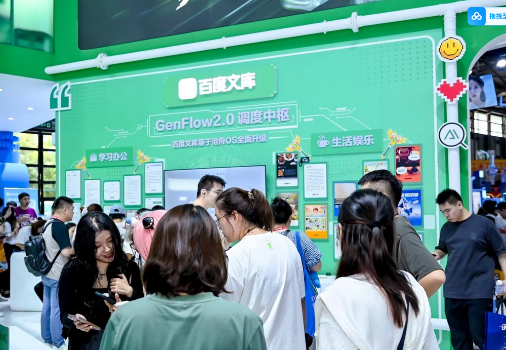 百度网盘与百度文库一起亮相展区,展示了GenFlow多智能体协作、百度网盘AI相机等应用。