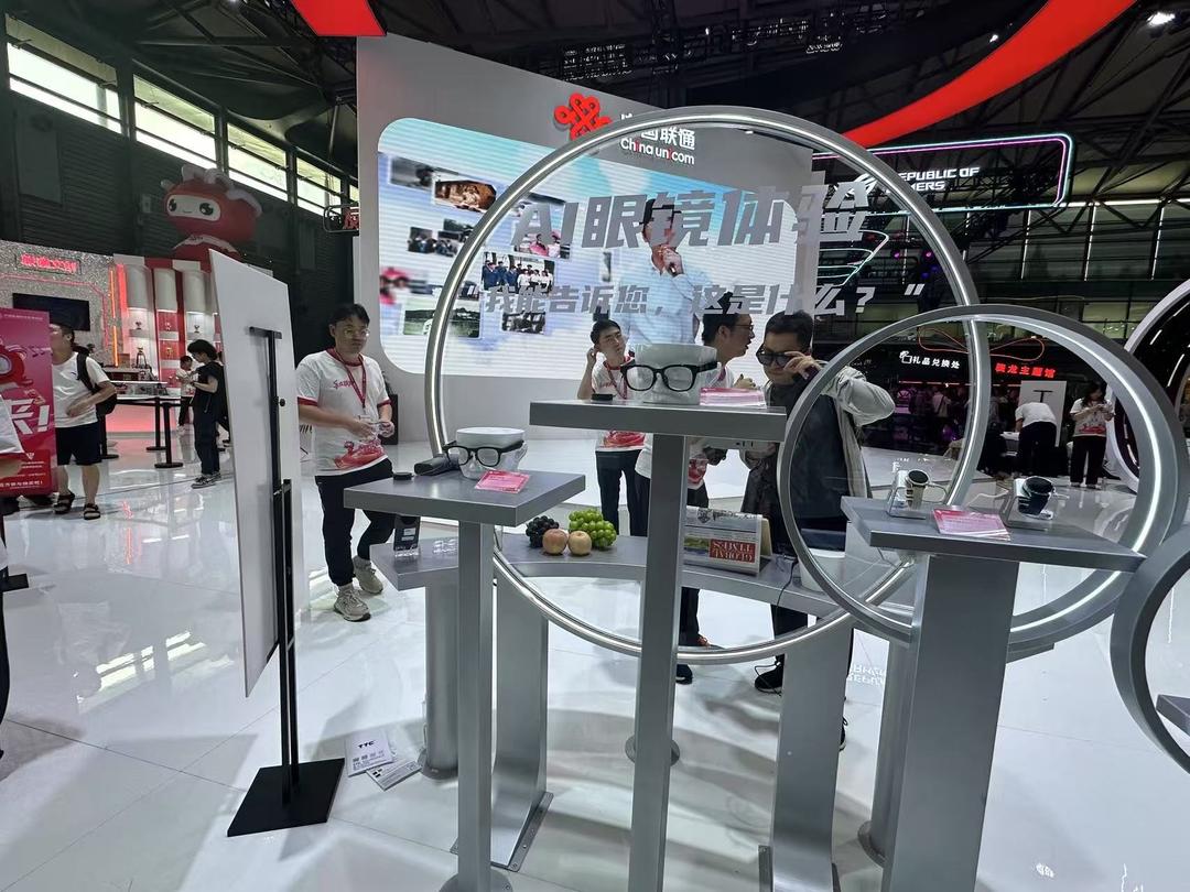联通展台上特设了AI眼镜体验区,包括小米AI眼镜、雷鸟V3眼镜、OPPO WATCH X2等。现场工作人员介绍,这些智能终端里采用了联通的网络数据卡。