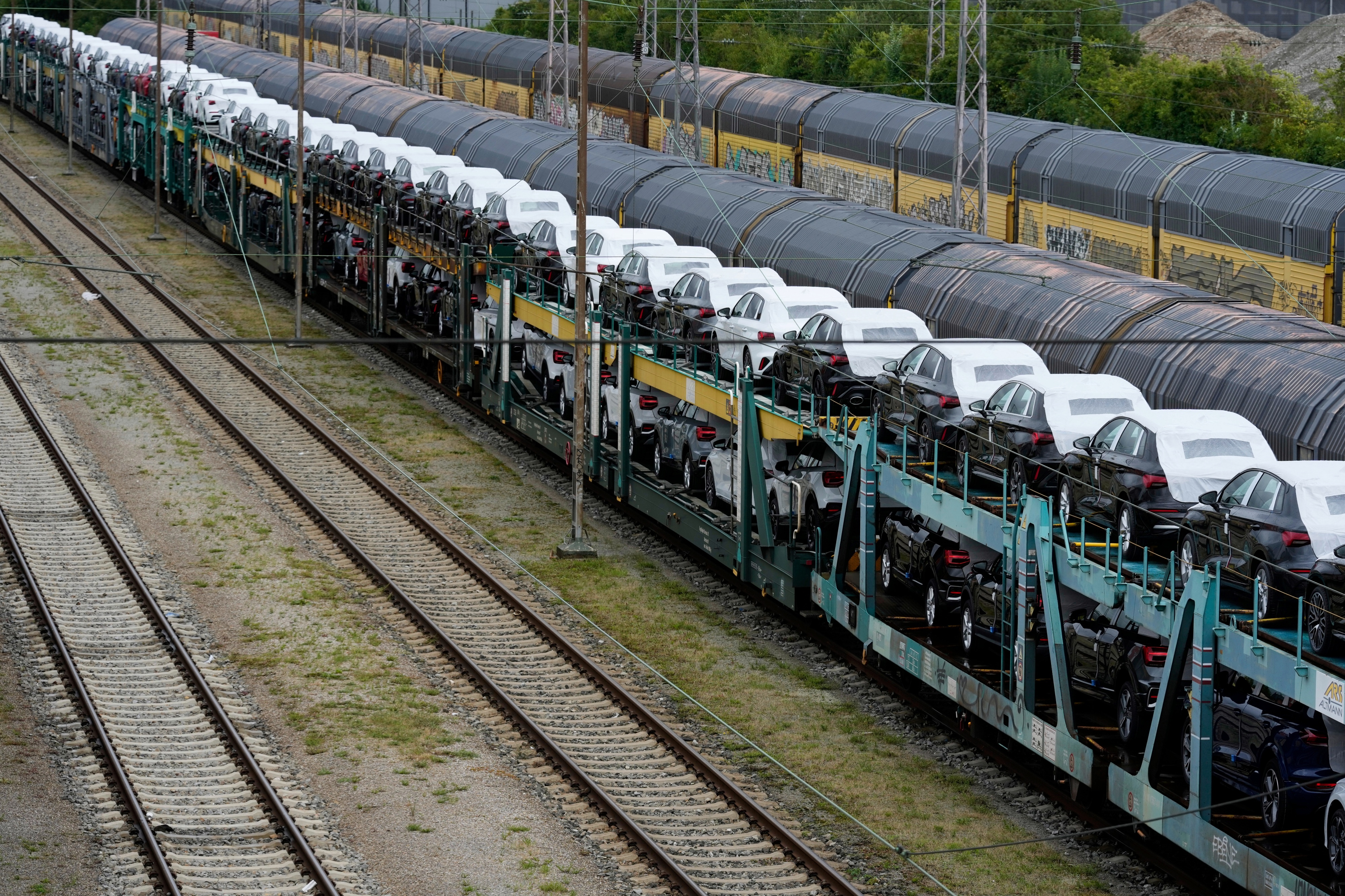 7月28日,在德国慕尼黑,火车运输新生产的大众和奥迪汽车。新华社发