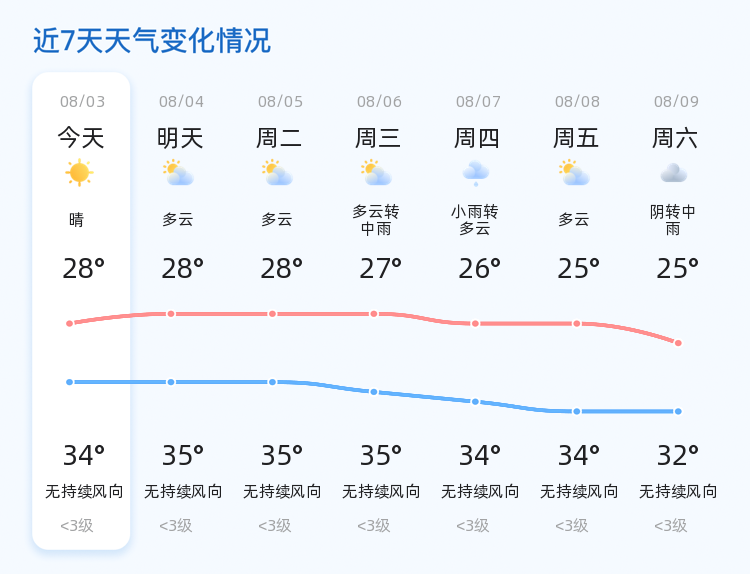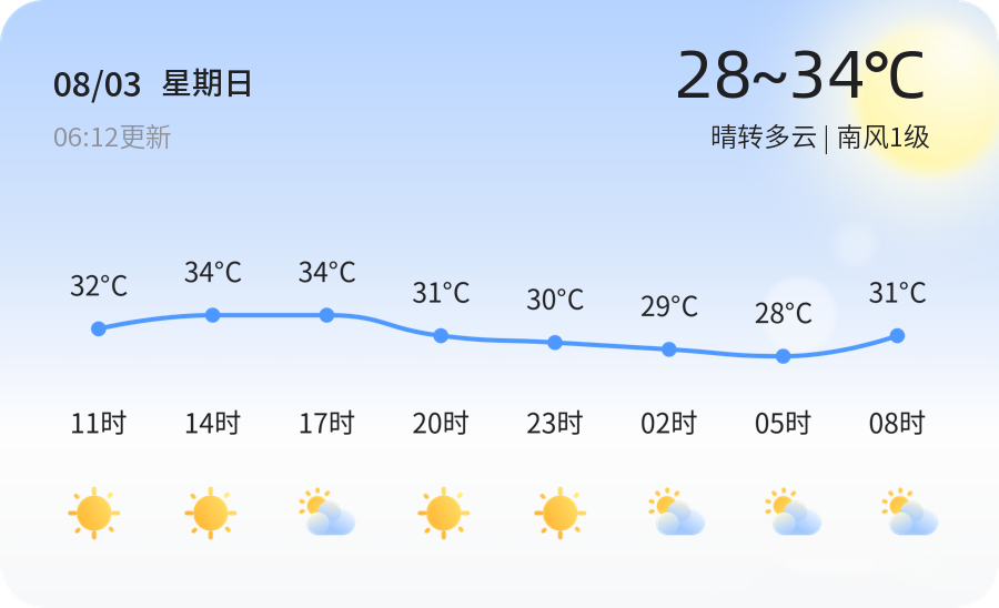 今天是8月3日,星期日,农历润六月初十。菏泽市今日天气晴转多云,气温在28℃至34℃之间,湿度较高,达到83%。风力较小,为南风1级,空气质量良好,PM2.5指数为23。各区天气情况总体稳定,市民出行需注意防晒和适时补水。