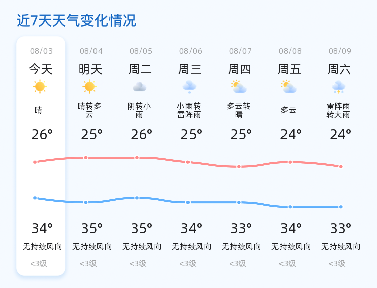 今日是8月3日,星期日,农历润六月初十,淄博市迎来了一天的晴朗天气。全市各区普遍呈现晴好天气,气温较为适宜,最高气温达到34℃,最低气温为26℃。目前,淄博市的实时温度为25.9℃,西南风1级,空气湿度较高,达到94%,PM2.5指数为24,空气质量良好。