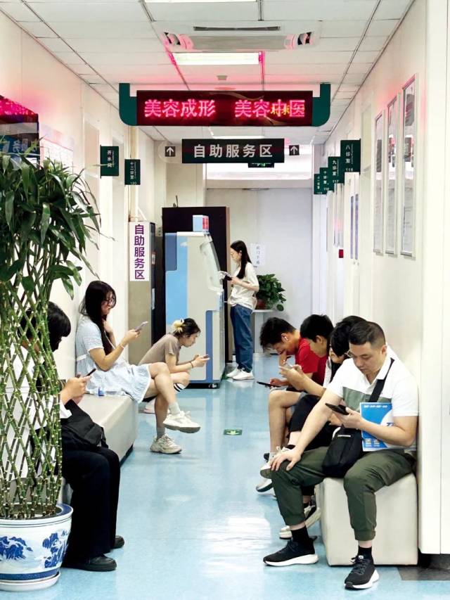 2025年7月14日,北京大学第三医院医疗美容楼内候诊的患者。摄影/胡可欣