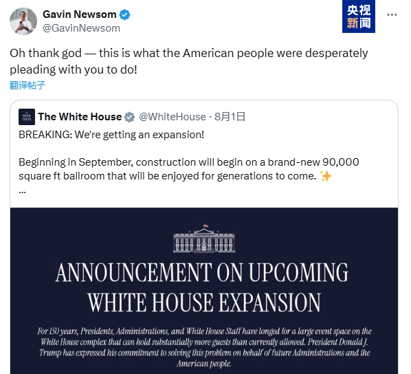 纽森团队当天也发帖称,特朗普及其政府“更关心的是宴会厅,而非被他们剥夺了医保的1700万人”。此前有分析称特朗普政府推动的“大而美”税收与支出法案预计导致约1000万美国人失去医疗保险。